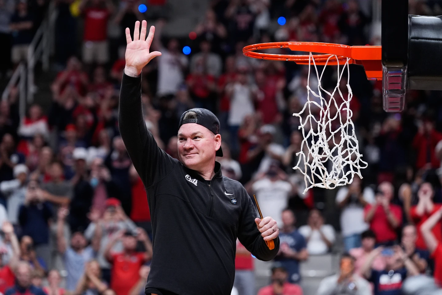 El entrenador Tommy Lloyd subió la escalera, cortó el último hilo de la red y saludó a los fanáticos de Arizona mientras coreaban: “¡Tommy! ¡Tommy!”.