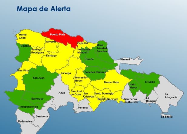 En alerta roja está Puerto Plata; en amarilla se encuentran el Distrito Nacional, la provincia Santo Domingo, Monseñor Nouel, Valverde, Santiago, Santiago Rodríguez, La Vega, Montecristi, Elías Piña, Espaillat, San Cristóbal, Monte Plata y San José de Ocoa.