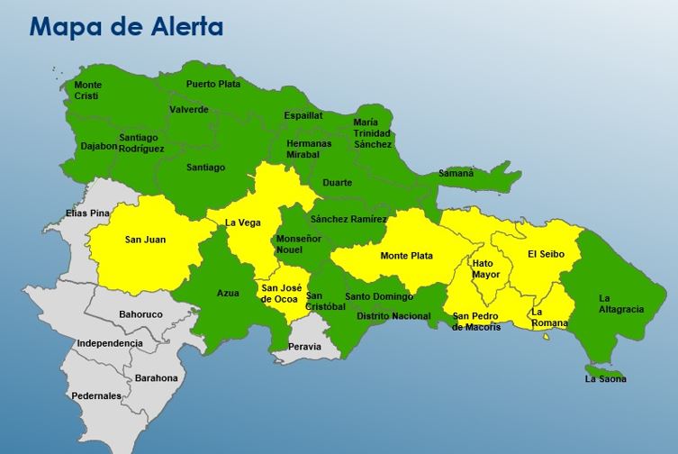 Las provincias en alerta amarilla son La Vega, San José de Ocoa, Monte Plata, San Pedro de Macorís, San Juan, El Seibo, La Romana y Hato Mayor.