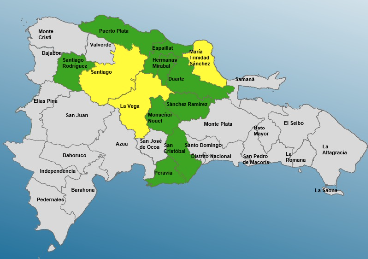 En alerta amarilla se encuentran María Trinidad Sánchez, La Vega y Santiago; mientras que en verde se encuentran Santiago Rodríguez, Espaillat, Duarte (en especial el Bajo Yuna), Sánchez Ramírez, San Cristóbal, Peravia, Hermanas Mirabal, Monseñor Nouel y Puerto Plata.