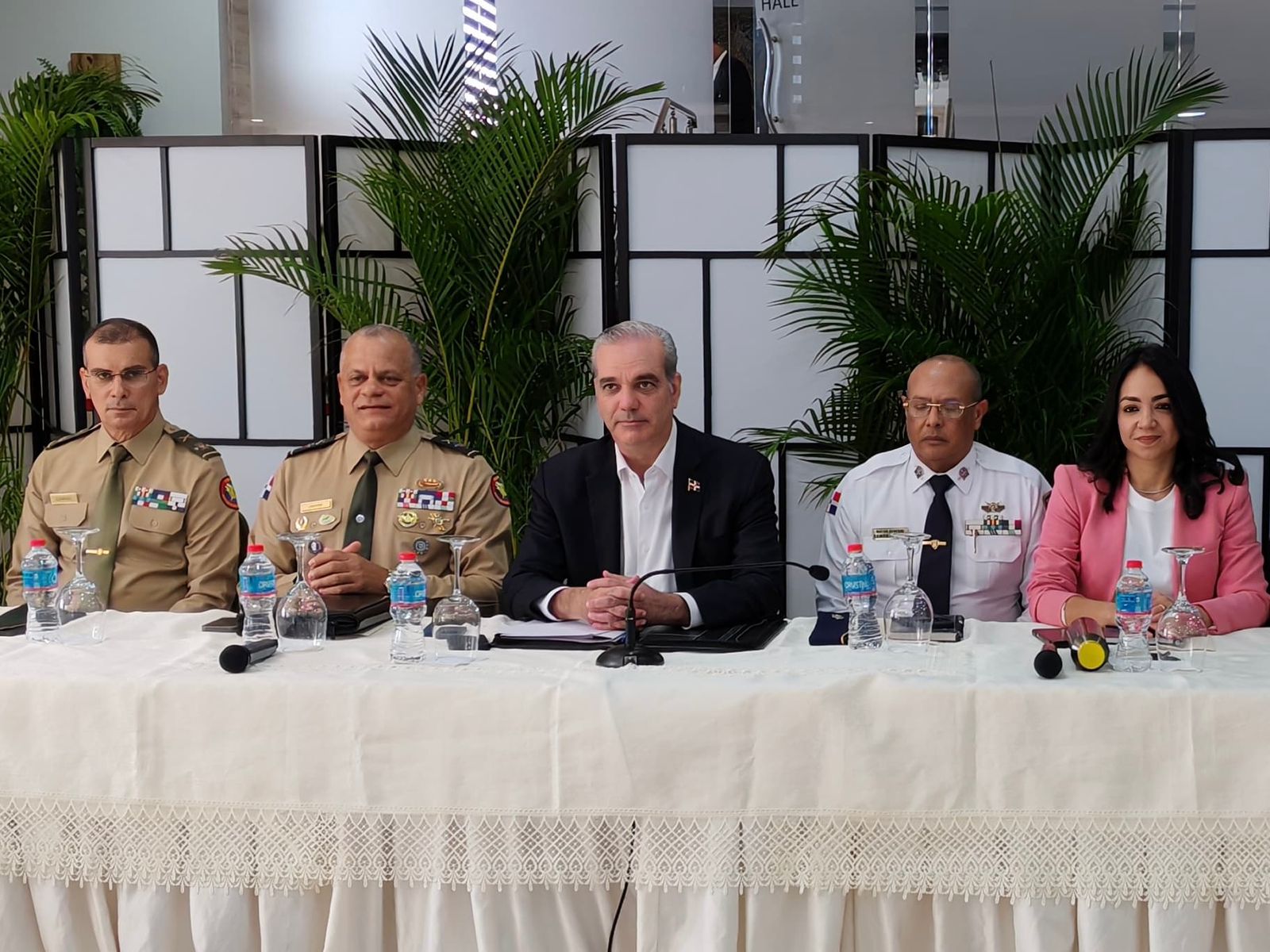 En compañía del mandatario, se encuentran los ministros de Interior y Policía, Faride Raful; de Defensa, teniente general Carlos Antonio Fernández Onofre; la procuradora General de la República, Yeni Berenice Reynoso; el comandante general del Ejército de República Dominicana y Comandante del Comando Conjunto Unificado, mayor general Jorge Camino Pérez; el director de la Policía Nacional, mayor general Ramón Antonio Guzmán Peralta y el viceministro de la Presidencia para Proyectos Especiales y Coordinación de Seguridad, Roger G. Pujols.